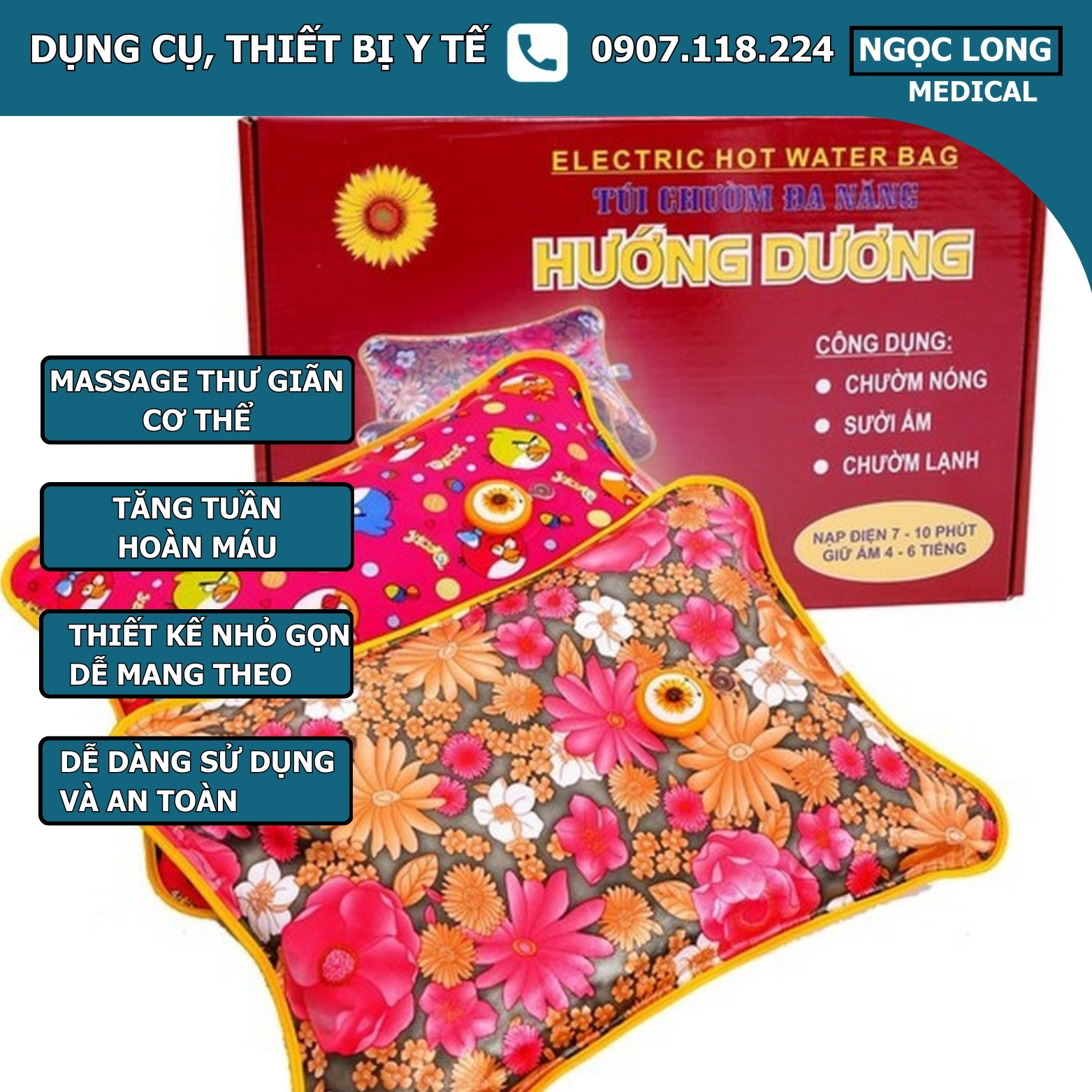 Túi chườm nóng lạnh điện tử Hướng Dương là thiết bị chăm sóc sức khỏe tiện lợi giúp giảm đau nhức cơ bắp, thư giãn cơ thể và hỗ trợ tuần hoàn máu. Sản phẩm được thiết kế với công nghệ làm nóng nhanh bằng điện, giúp túi đạt nhiệt độ phù hợp chỉ sau vài phút sạc điện và giữ nhiệt lâu để người dùng thư giãn hiệu quả.